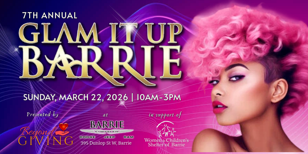 7th Annual Glam It Up Barrie, presented by Beyond Giving to support the Women & Children’s Shelter of Barrie. Enjoy makeovers, shopping, and connection, all while helping those in need.
